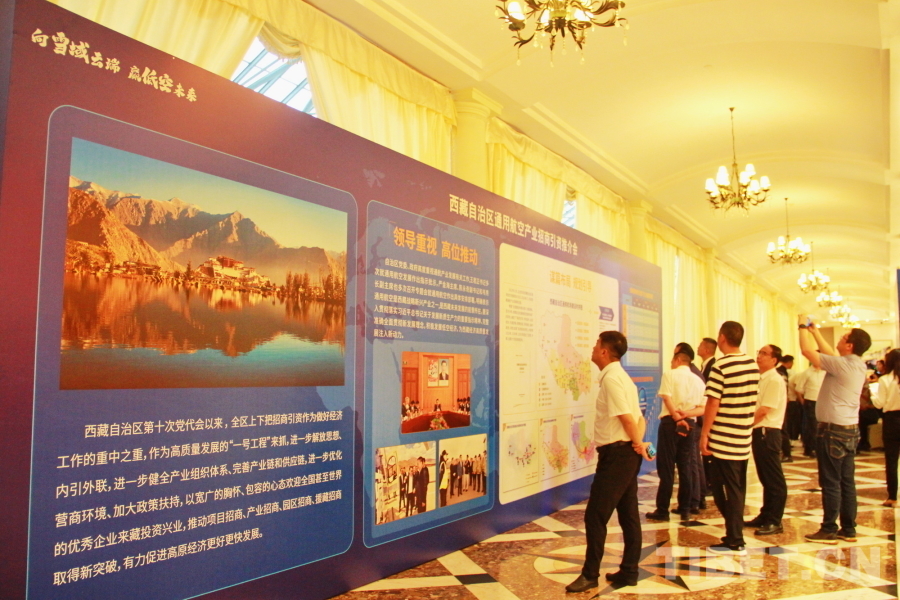 圖為(wei) 西藏自治區通用航空產(chan) 業(ye) 招商引資推介會(hui) 現場設置的展板吸引與(yu) 會(hui) 嘉賓駐足了解 攝影:劉莉