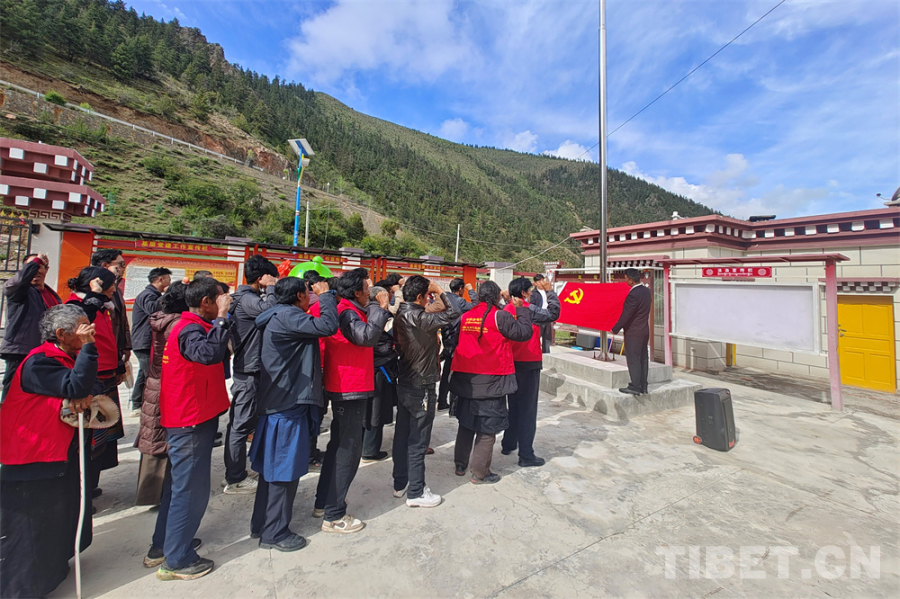 圖為(wei) 洛隆縣中亦鄉(xiang) 嘴村的黨(dang) 員重溫入黨(dang) 誓詞的現場
