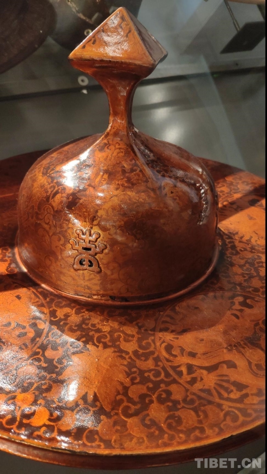 14號藏品為(wei) 僧官帽,出自西藏,進入館藏時間為(wei) 1905年。據博物館介紹,這頂漆帽原屬於(yu) 寺院一位僧官所穿服飾的一部分。過去,西藏地方政府實行“政教合一製度”,寺院作為(wei) 一個(ge) 地方的宗教事務和寺院自身的管理者和統治者,同時又是這個(ge) 地方社會(hui) 的主要管理者和統治者。因此,遍布西藏各地的寺院往往都是當地的政治、經濟、文化中心,具備政治、經濟、教育、司法等職能。寺院內(nei) 部設立不同級別或不同分管領域的僧官來共同管理整個(ge) 寺院的內(nei) 外政教事務。