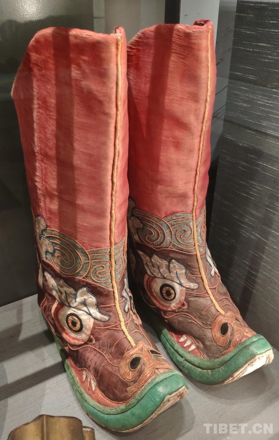 15號藏品為(wei) 龍首紋藏靴,出自西藏,進入館藏時間為(wei) 1905年。據博物館介紹,這雙靴子不是一般藏族百姓穿的靴子,而是降神者在降神儀(yi) 式上所穿用的。這雙靴子除了具有一般藏靴的特征外,鞋麵繡有龍首,代表神聖之意。靴型寬大,前頭略尖,且向上翹起,造型別有韻致。