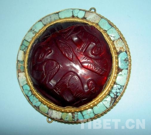 大英博物館藏19世紀圓形銅鎏金鑲紅玻璃綠鬆石飾品(16號)