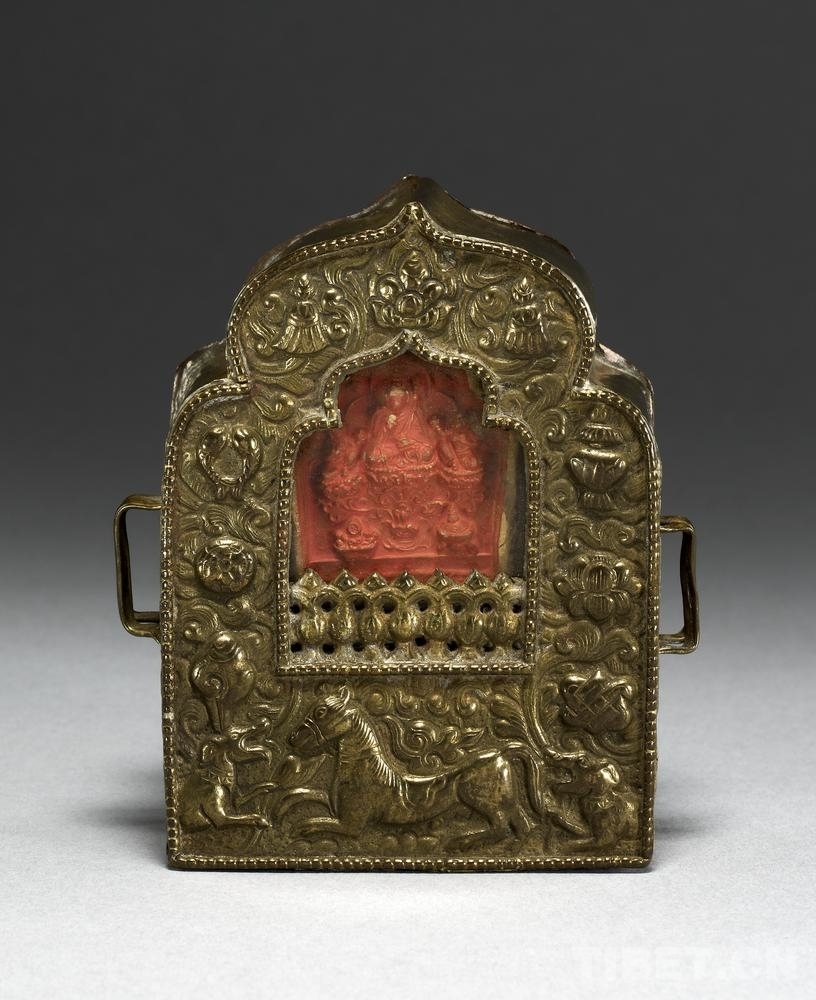 19號藏品為(wei) 銅製“嘎烏(wu) ”,內(nei) 裝有“擦擦”和香料包,出自西藏,進入館藏時間為(wei) 1905年。“嘎烏(wu) ”,是藏語的音譯,指護身佛的盒子,即小型佛龕。盒子裏一般裝有“擦擦”佛像、印著經文的綢片、舍利子或者甘露丸、由高僧念過經的藥丸,以及活佛的頭發、衣服的碎片等。“嘎烏(wu) ”還是精美的裝飾品。其形狀不一,一般為(wei) 銀質或銅質,盒麵上鑲嵌有瑪瑙、綠鬆石,雕刻有多種花紋圖案。