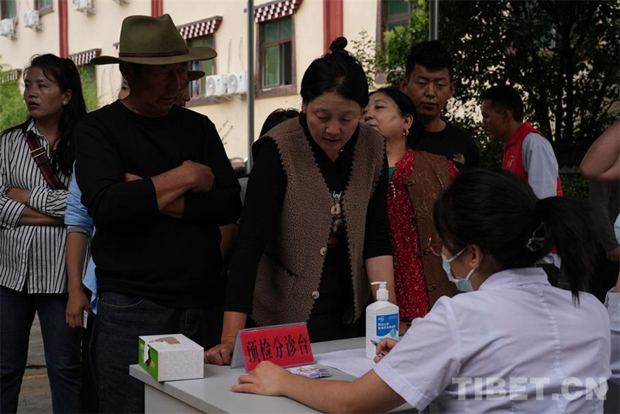 圖為(wei) 巴塘縣群眾(zhong) 在預檢分診台排隊領取病科條 攝影:姚浩然