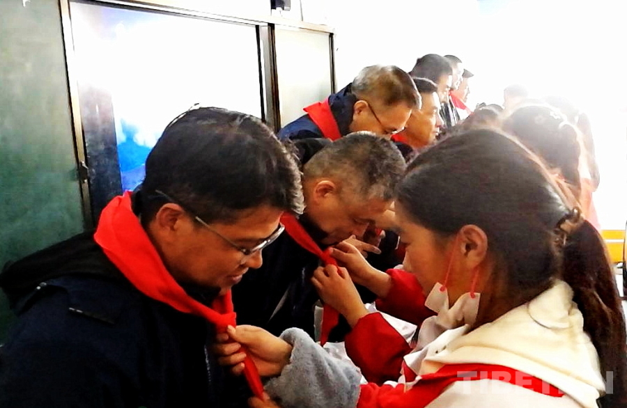 圖為(wei) 四川省甘孜州石渠縣第二完全小學學生為(wei) 醫療專(zhuan) 家們(men) 獻上鮮豔的紅領巾 攝影:劉莉