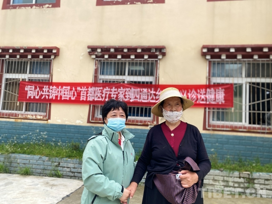 圖為(wei) 當地71歲村民一手兜著從(cong) 藥房領取的藥品,另一隻手熱情地握住活動誌願者航空總醫院產(chan) 科武海榮醫生的手,表達著她深深的謝意 攝影:格桑