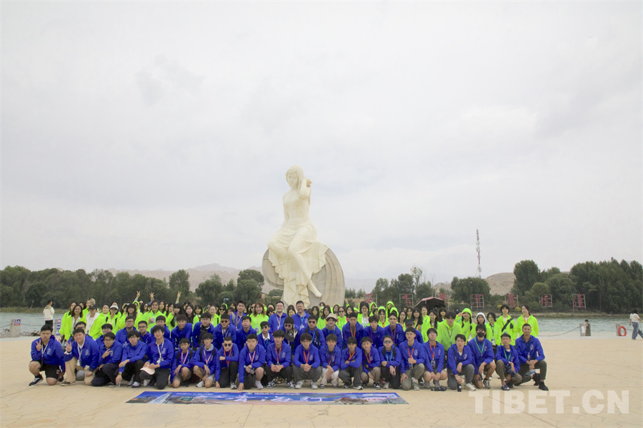 圖為(wei) 香港交流團青少年在貴德黃河少女雕塑前合影留念 攝影:桑吉