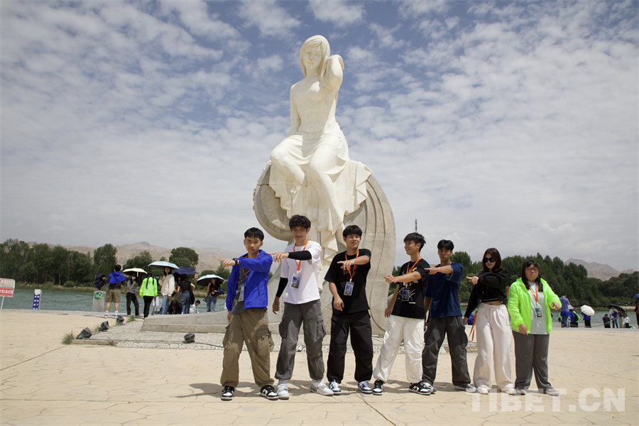 圖為(wei) 香港青少年在黃河少女雕塑前拍照 攝影:桑吉