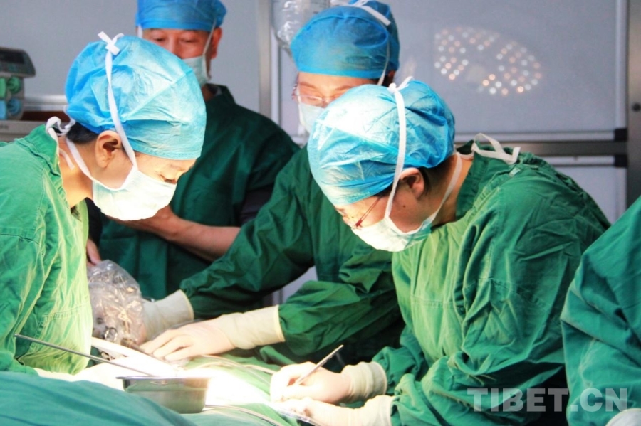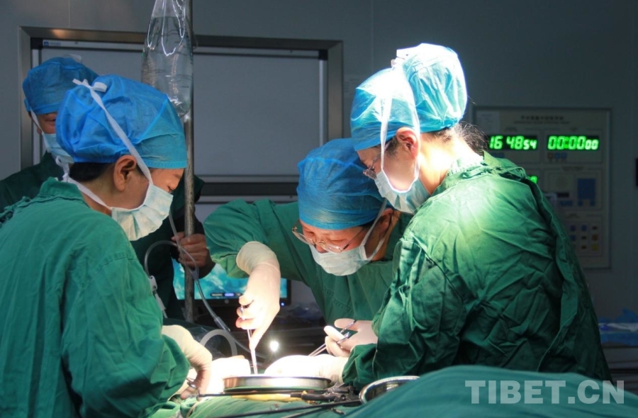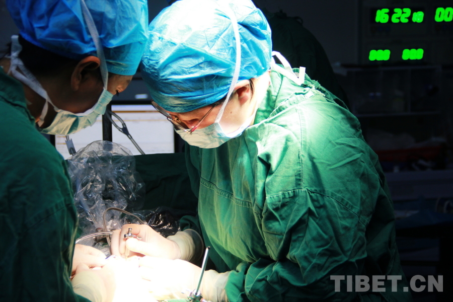 圖為(wei) 航空總醫院婦科主任餘(yu) 立群(右二)在手術中指導甘孜縣人民醫院醫生操作手術 攝影:劉莉
