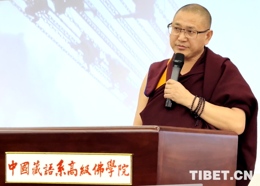 圖為(wei) 白瑪紮西在中國藏語係高級佛學院課堂上發言 供圖:白瑪紮西