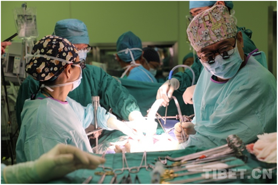 圖為(wei) 醫療專(zhuan) 家團隊正在為(wei) 患兒(er) 實施手術 攝影:龍真多吉