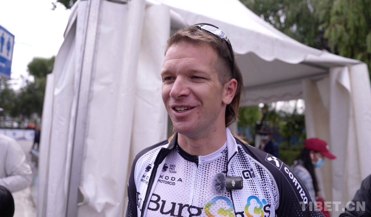 圖為(wei) 拉薩繞圈賽第二名、來自布爾戈斯·BH職業(ye) 隊的GATE Aaron Murray接受新利平台的采訪 攝影:德吉卓瑪