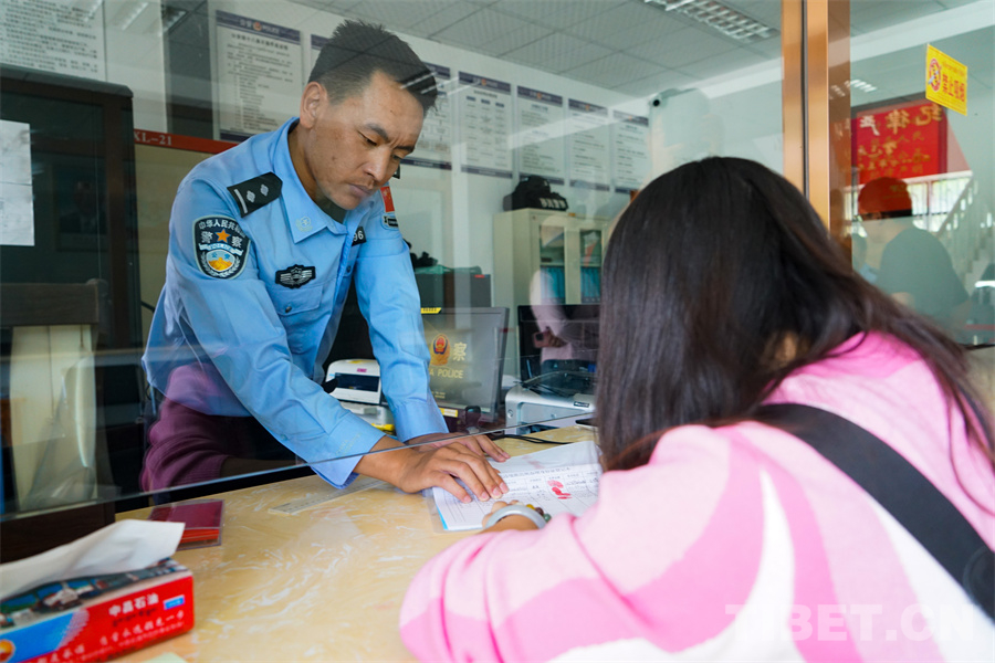 圖為(wei) 移民管理警察丹增永鋒正在辦理窗口業(ye) 務 攝影:趙振宇