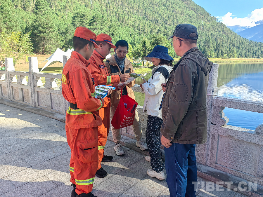 圖為(wei) 波密縣森林消防員向遊客講解森林防火常識