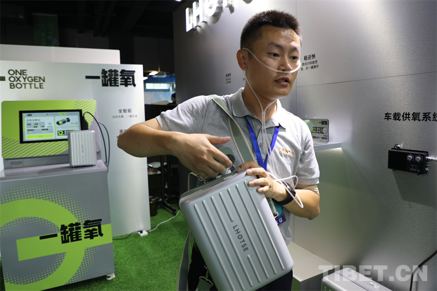 圖為(wei) 318自駕遊全國裝備展銷會(hui) 上的工作人員正在講解如何使用高原上的氧氣背包 攝影:王妍丹