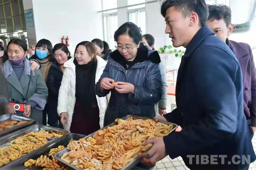 圖為(wei) 次仁拉姆查看學校食堂內(nei) 夥(huo) 食供應情況