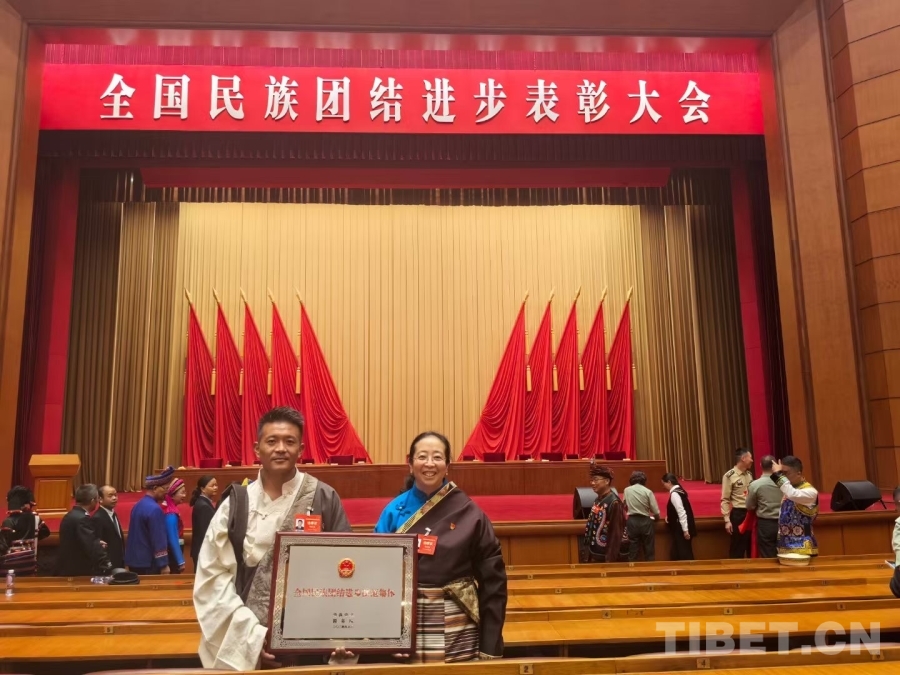 圖為(wei) 全國民族團結進步模範集體(ti) 代表頓珠才嘎與(yu) 全國民族團結進步模範個(ge) 人獲得者次仁拉姆