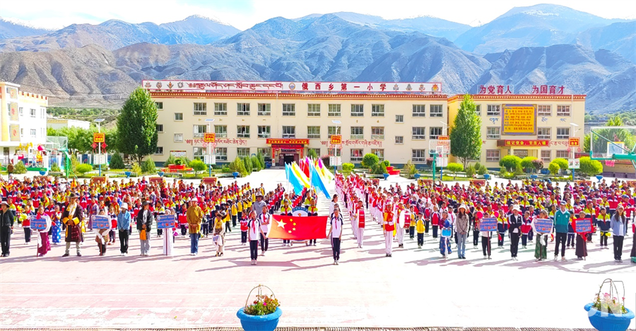 圖為(wei) 西藏自治區昌都市洛隆縣俄西鄉(xiang) 第一小學開展升旗儀(yi) 式等活動