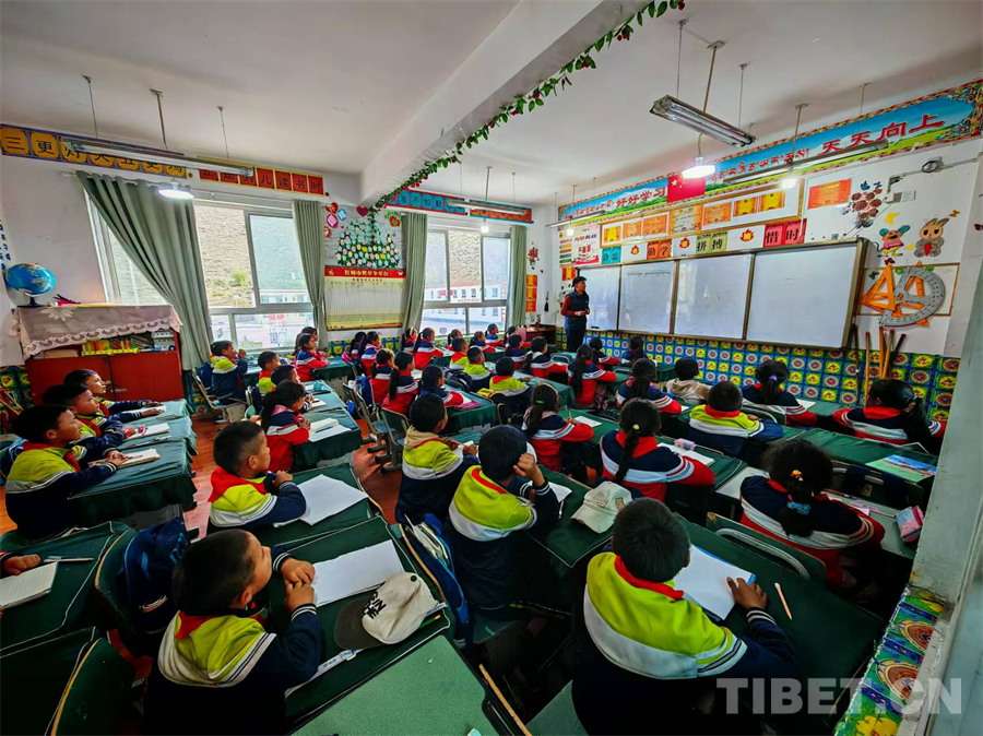 圖為(wei) 洛隆縣俄西鄉(xiang) 第一小學的學生們(men) 正在認真聽老師講課