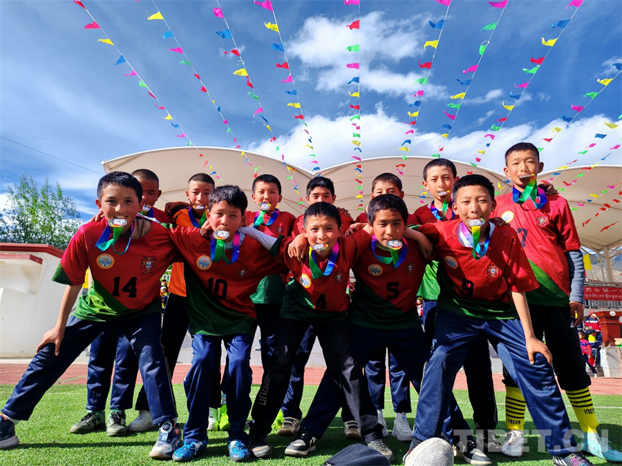 圖為(wei) 洛隆縣俄西鄉(xiang) 第一小學的學生們(men) 在足球場上開心合影