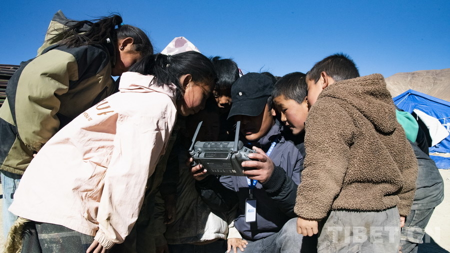 圖為(wei) 在左措村受災群眾(zhong) 安置點,小朋友們(men) 圍觀無人機空中視角 攝影:趙振宇