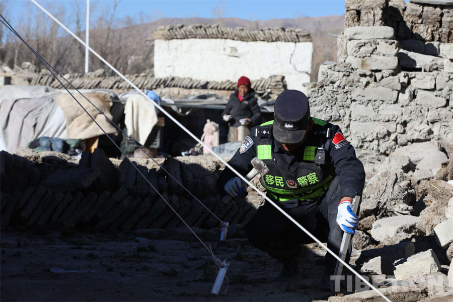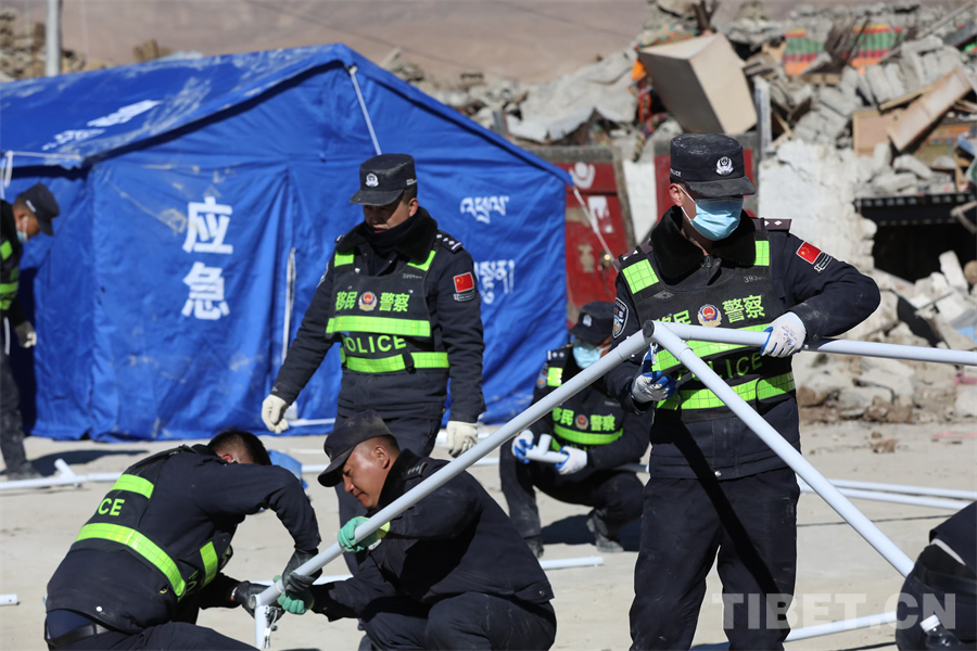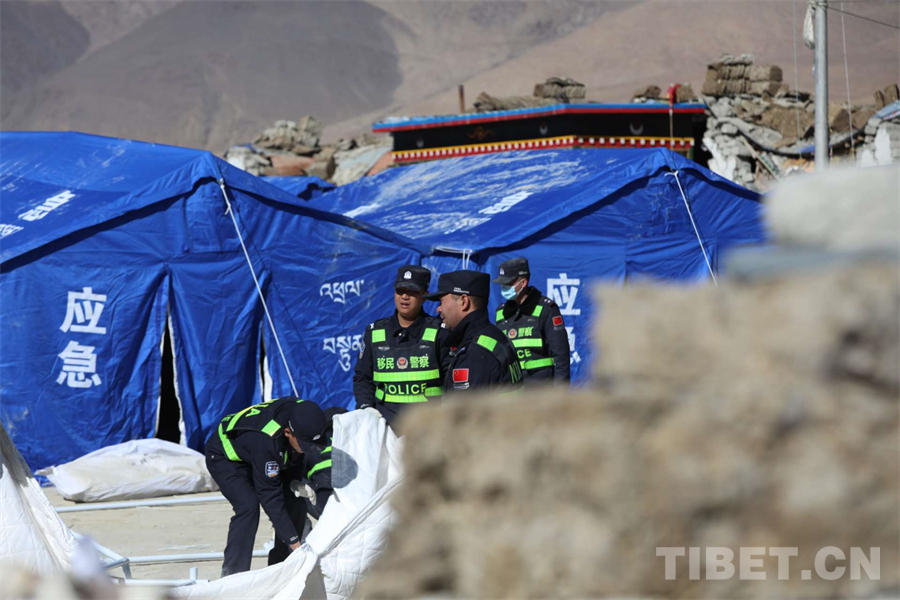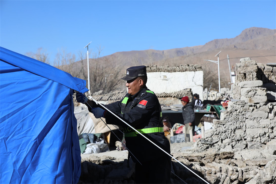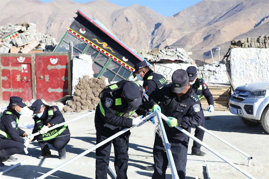 圖為(wei) 西藏移民管理警察在定日縣長所鄉(xiang) 雜村為(wei) 受災群眾(zhong) 安裝帳篷 攝影:郭遠敬