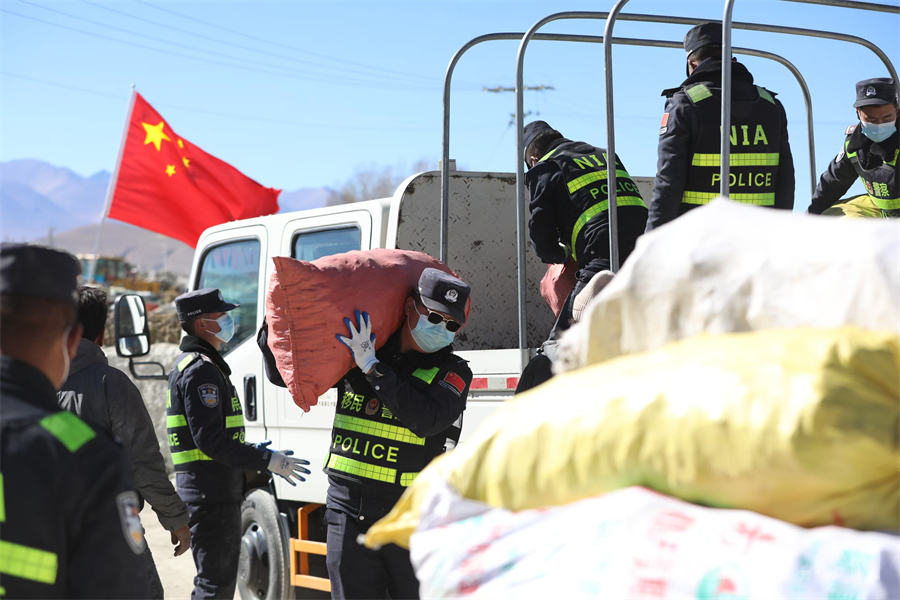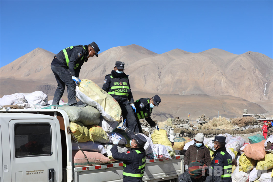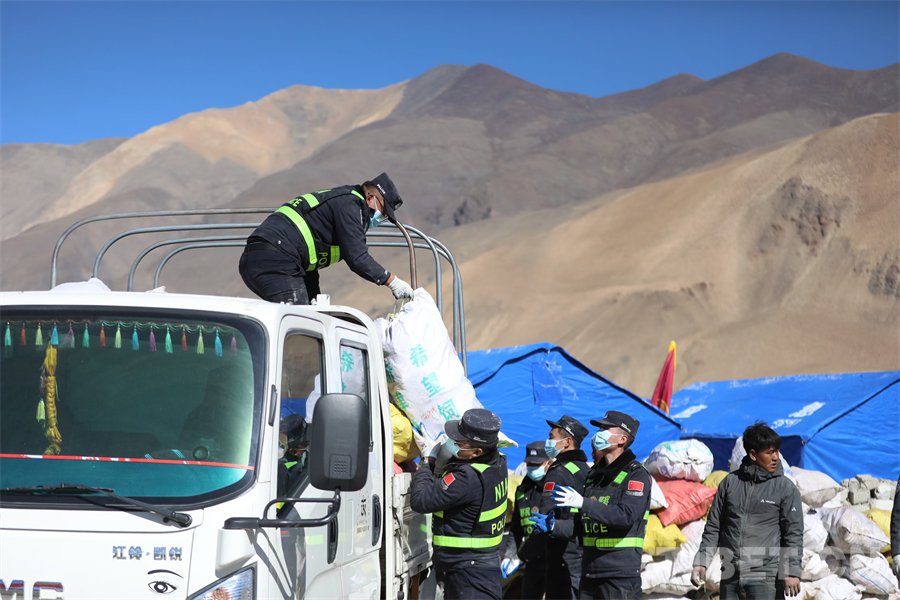 圖為(wei) 西藏移民管理警察在定日縣長所鄉(xiang) 雜村為(wei) 受災群眾(zhong) 轉移物資 攝影:郭遠敬