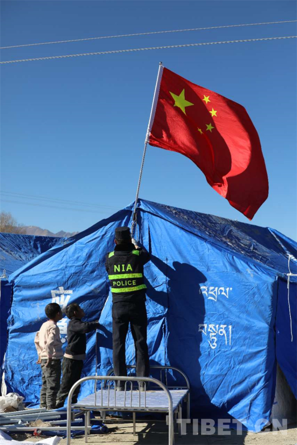 圖為(wei) 西藏移民管理警察在定日縣長所鄉(xiang) 雜村受災安置點懸掛五星紅旗 攝影:郭遠敬