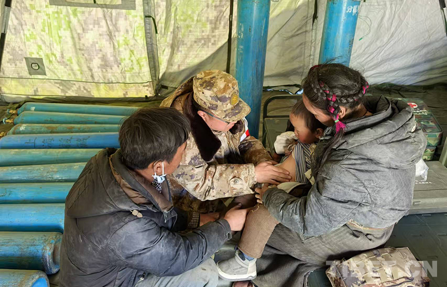 圖為(wei) 西藏軍(jun) 區總醫院救援隊伍在安置點進行巡診