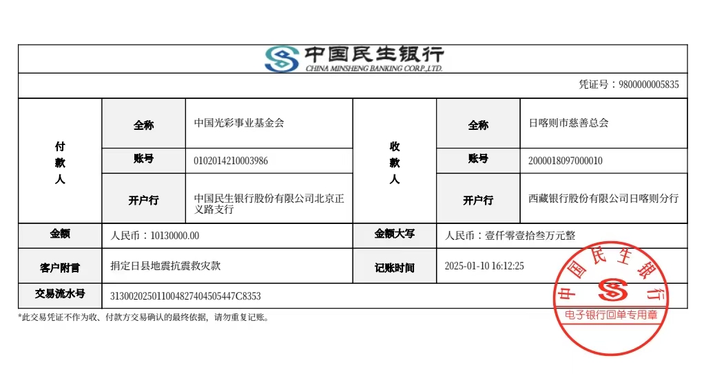 圖為(wei) 中國光彩事業(ye) 基金會(hui) 捐款回單(其中一筆) 中國光彩事業(ye) 基金會(hui) 供圖