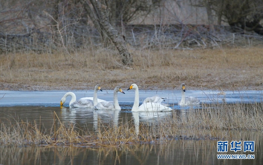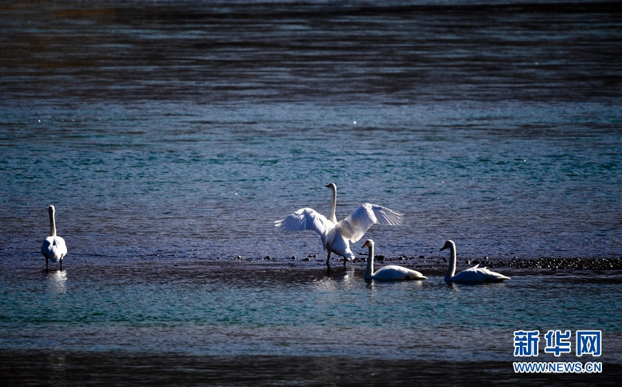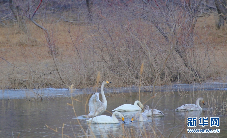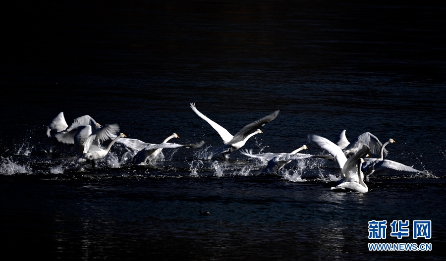 一群天鵝在千姿湖嬉戲。新華網 宋忠勇 攝