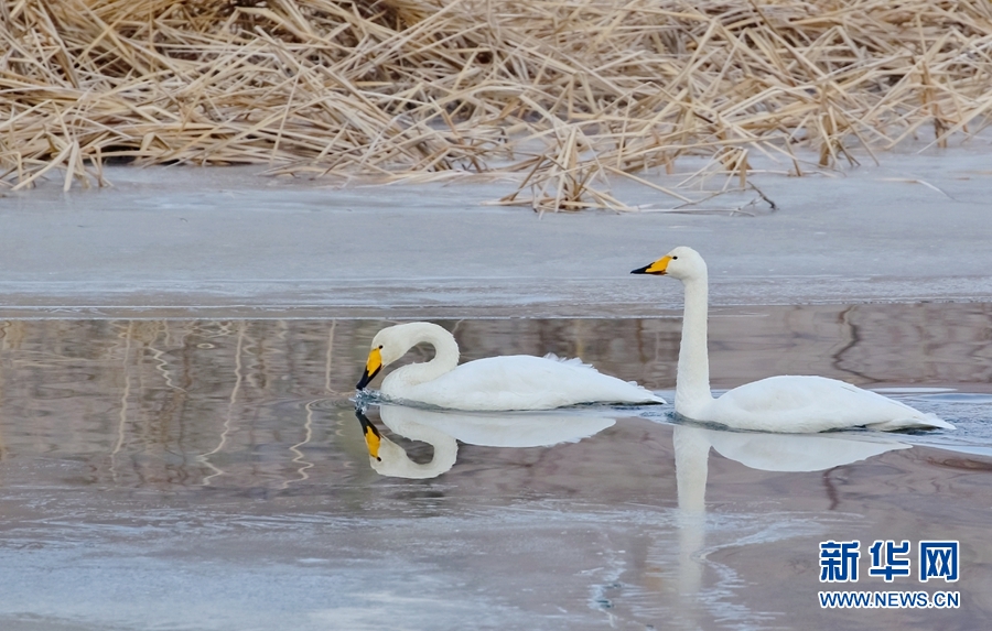 兩(liang) 隻天鵝在千姿湖中遊弋。新華網 宋忠勇 攝
