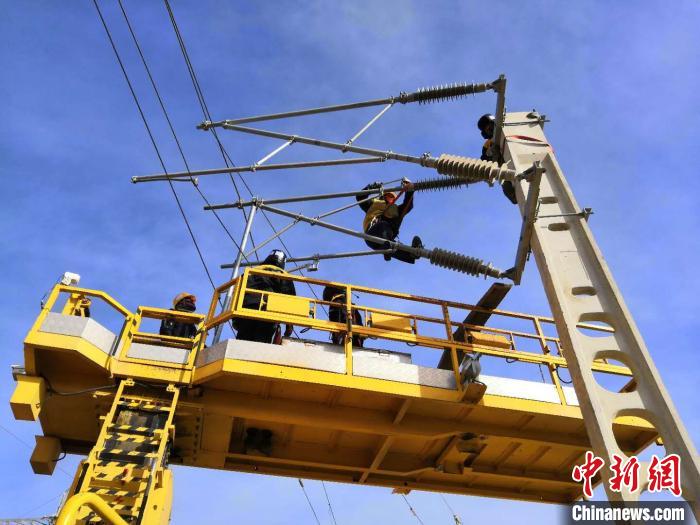 圖為(wei) 中國鐵路青藏集團有限公司西寧供電段格爾木接觸網大修工區的接觸網工在檢修接觸網。周賀 攝
