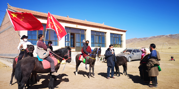 宣傳(chuan) 隊騎著馬開展宣傳(chuan) 。(黃南州委組織部供圖)