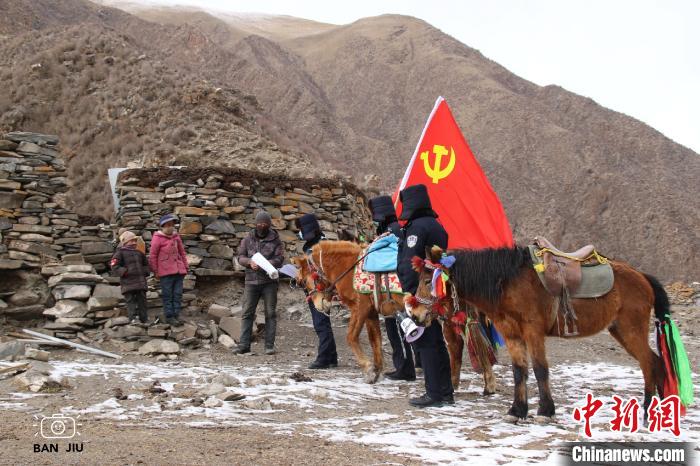圖為(wei) 馬背巡邏隊在轄區內(nei) 為(wei) 牧民贈送口罩、發放藏漢雙語宣傳(chuan) 資料。 紮西蘭(lan) 周 攝