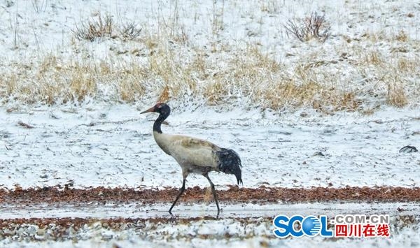 3月16日,在四川省阿壩州紅原縣安曲鎮的草原濕地,到處是雪茫茫的一片,從(cong) 雲(yun) 南、貴州等地越冬歸來的一群黑頸鶴在此嬉戲覓食。它們(men) 時而逐嬉鬧,時而展翅飛翔,與(yu) 周邊的犛牛、赤麻鴨相映成趣,給沉寂的高原帶來無限生機和活力。