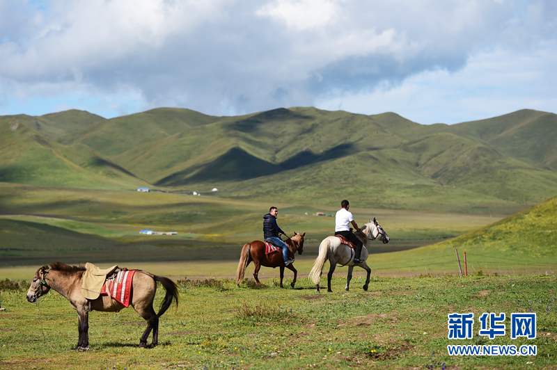 2019年8月13日,遊客在甘南藏族自治州碌曲縣尕海鎮尕秀村草原上騎馬。新華社記者 趙丁喆 攝