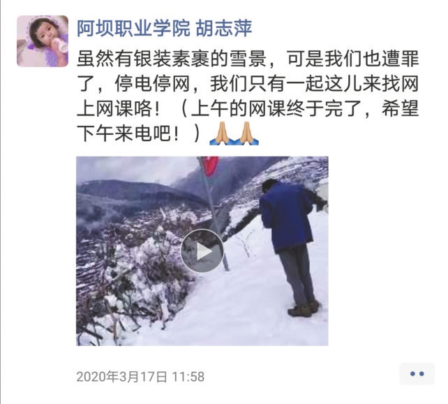 上完網課,胡誌萍發了一條朋友圈感慨當天的經曆:“雖然有銀裝素裹的雪景,可是我們(men) 也遭罪了,停電停網,我們(men) 隻有一起到這兒(er) 來找網上網課咯!”而讓她沒想到的是,這條朋友圈隨後引發了一場愛心接力……