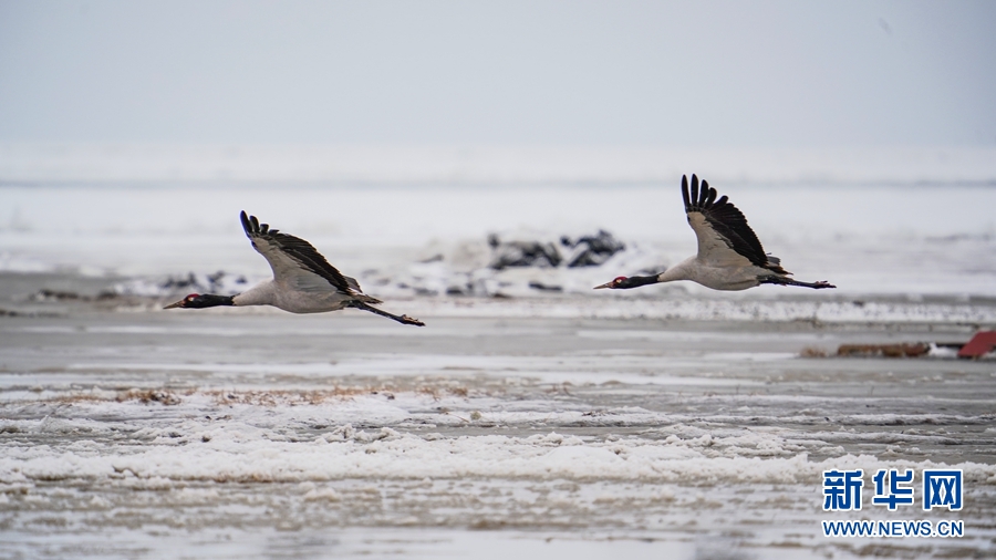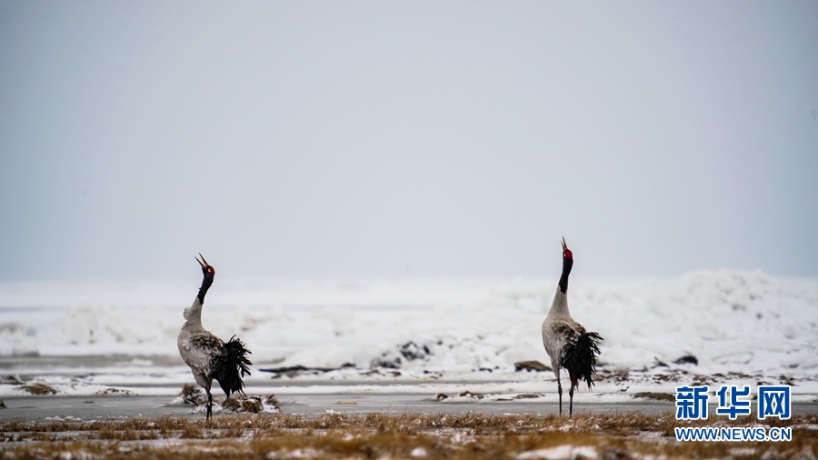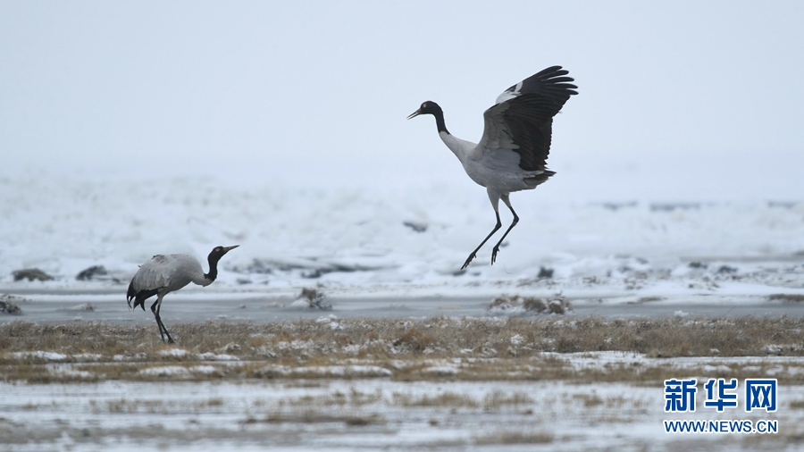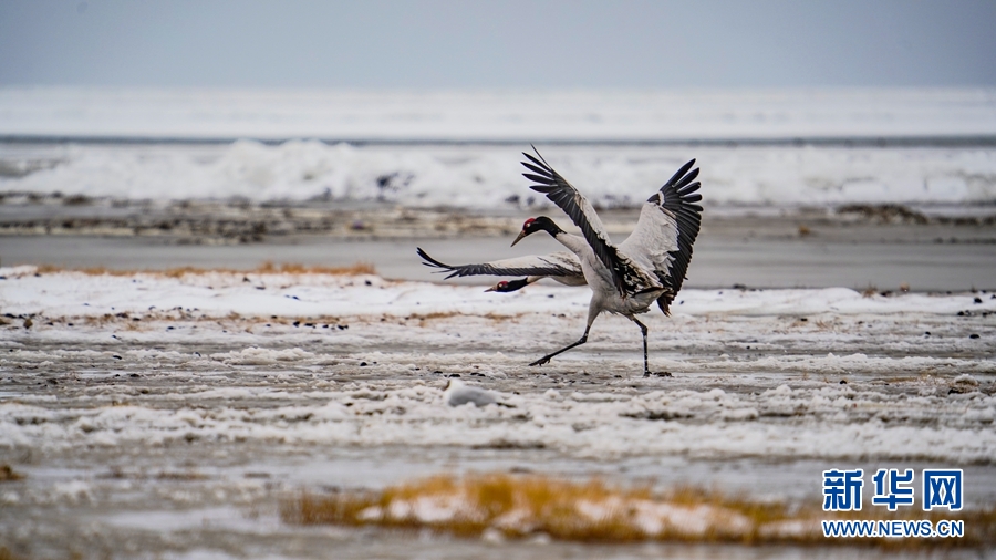 4月17日,受冷空氣影響,青海省海北藏族自治州剛察縣迎來一場春雪,兩(liang) 隻雪域“精靈”黑頸鶴在青海湖仙女灣景區“與(yu) 雪共舞”,上演青海湖畔最美“雪中情”。