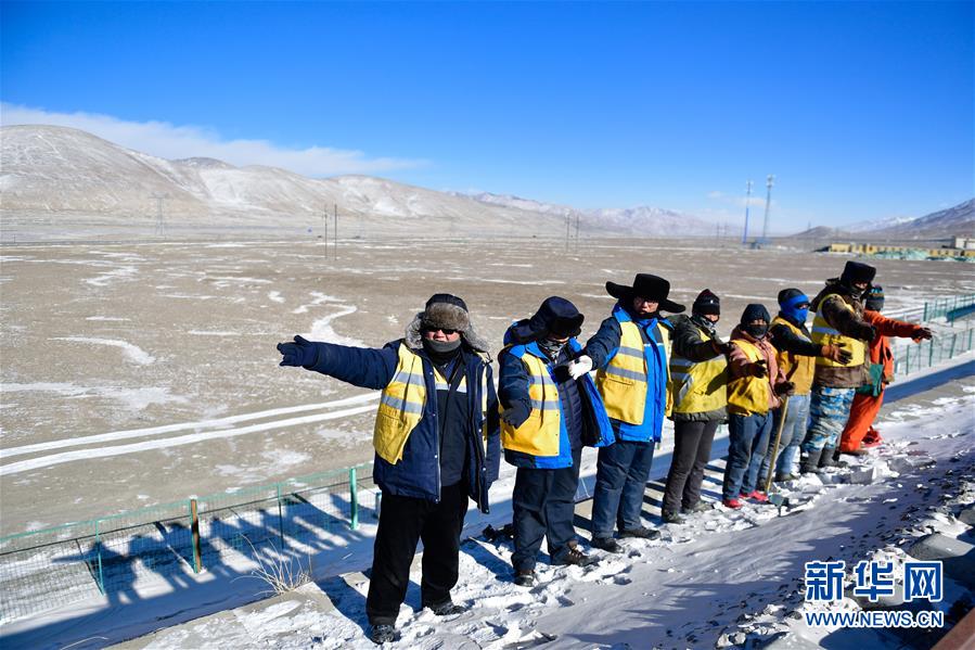 1月11日,在青藏鐵路望昆站附近,於(yu) 本蕃(左一)和工友們(men) 在施工前進行安全檢查。新華社記者 張龍 攝