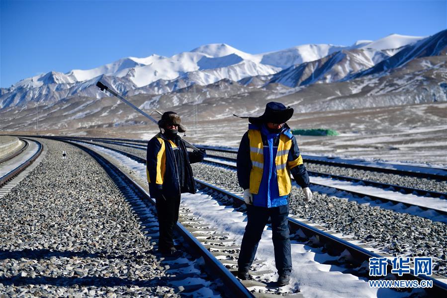 1月11日,於(yu) 本蕃(左)和工友在青藏鐵路望昆站附近巡檢鐵道。新華社記者 張龍 攝