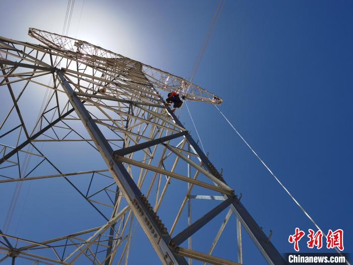 圖為(wei) 5月17日,檢修人員在海拔5700多米的五道梁檢修“電力天路”。 謝莉蓉 攝