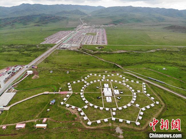 尕秀村的帳篷城由108頂大小各異的藏式風格帳篷組成。空中俯瞰,一頂頂帳篷如同一顆顆璀璨的珍珠,點綴著曬銀灘草原的秀美。楊豔敏 攝