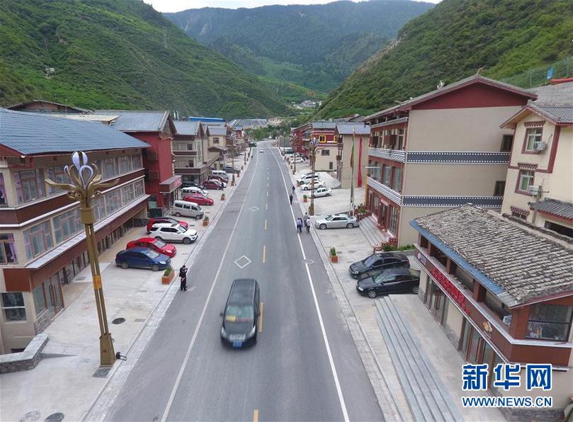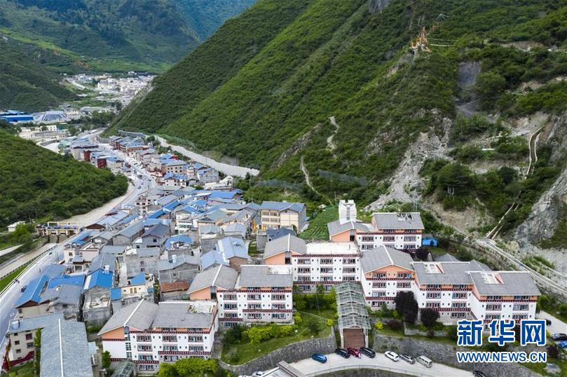 九寨溝地震震中九寨溝縣漳紮鎮新貌(無人機照片,6月18日攝)。 新華社記者 劉坤 攝