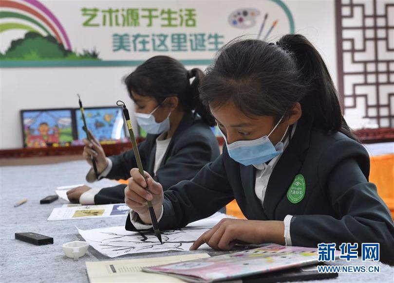 四川省阿壩藏族羌族自治州九寨溝縣九寨溝小學(原漳紮鎮小學)的學生在上國畫課(6月18日攝)。 新華社記者 劉坤 攝