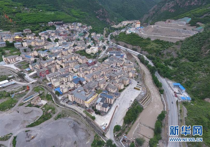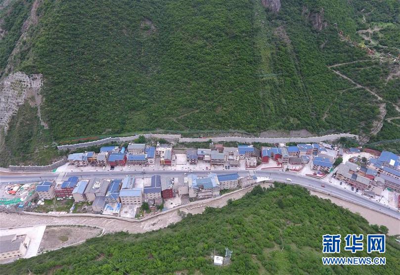 九寨溝地震震中九寨溝縣漳紮鎮新貌及攔石牆(無人機照片,6月18日攝)。 新華社記者 劉坤 攝