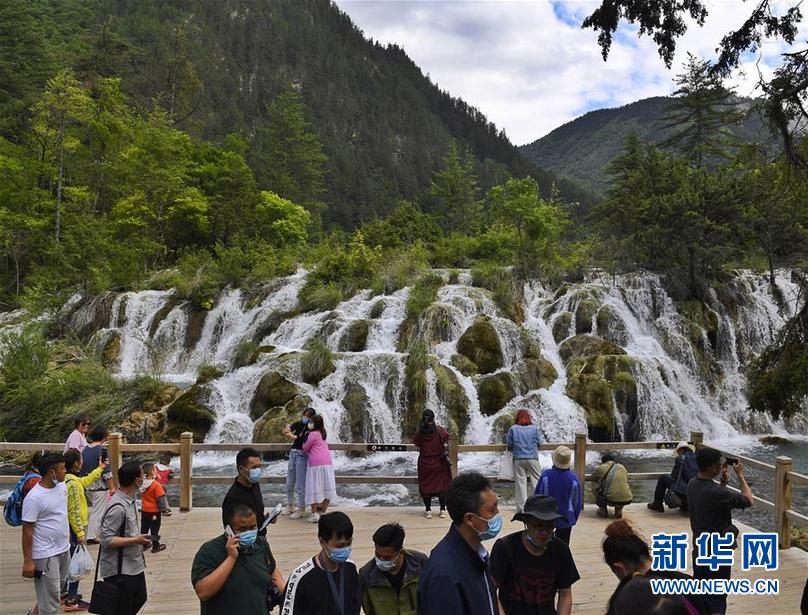 遊客在九寨溝景區遊玩(6月18日攝)。 新華社記者 劉坤 攝