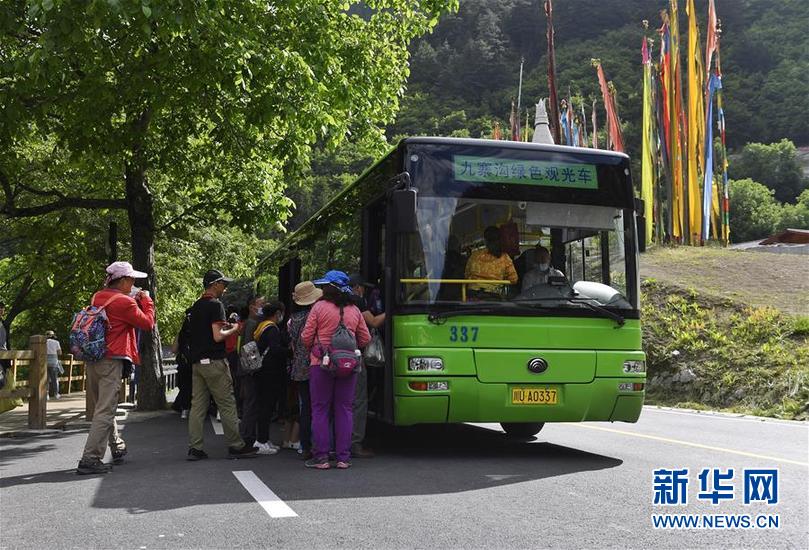 遊客在九寨溝景區內(nei) 乘坐觀光車(6月18日攝)。新華社記者 劉坤 攝