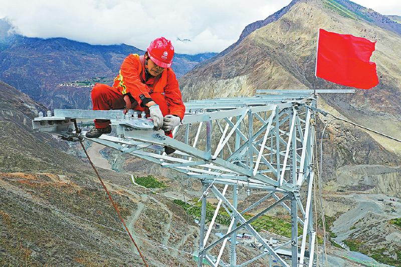 5月24日,甘孜州巴塘縣中咱-蘇窪龍35千伏線路工程78號塔放線現場,施工人員正在塔上進行放線作業(ye) 。