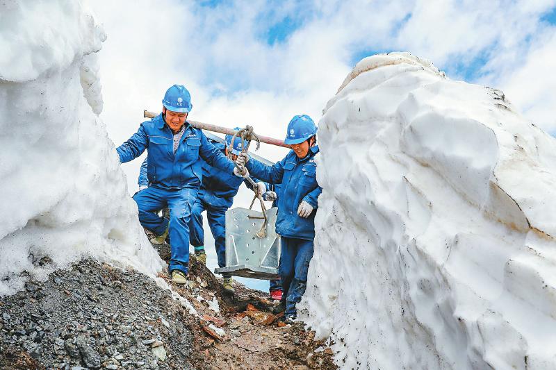 6月10日,阿壩州理縣夾壁—馬塘110千伏輸變電工程,建設者靠人力抬起沉重的塔材,艱難穿過高達2米的雪牆,前往組塔點位。