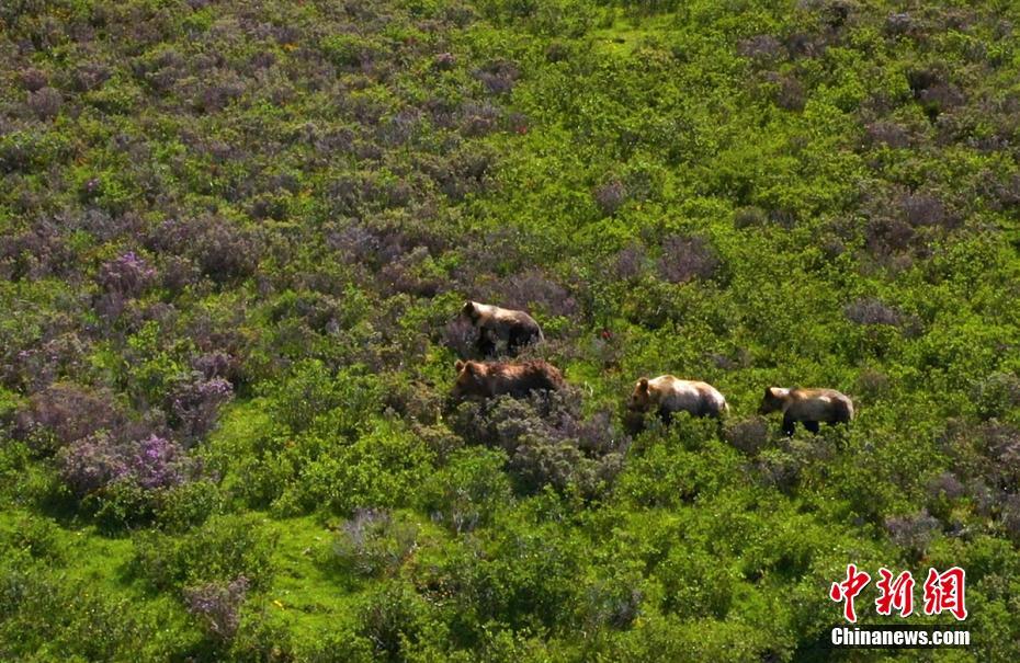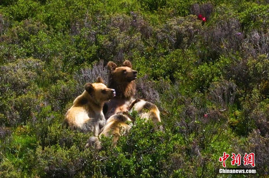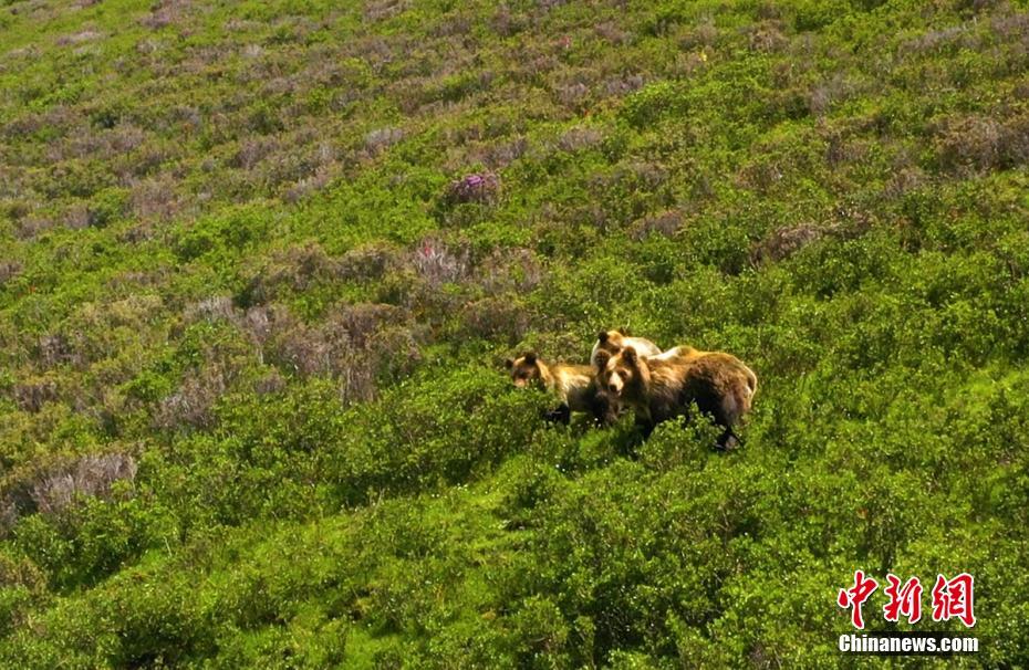7月13日下午,記者下鄉(xiang) 采訪途中,在海拔4500米的四川省甘孜藏族自治州石渠縣蒙宜鎮蒙格村附近一處水草豐(feng) 茂的山坡處拍攝時,偶然發現一隻棕熊媽媽曬著陽光浴給三隻小熊喂奶場景,棕熊媽媽喂奶結束後領著小熊寶寶們(men) 緩慢走向大山深處。